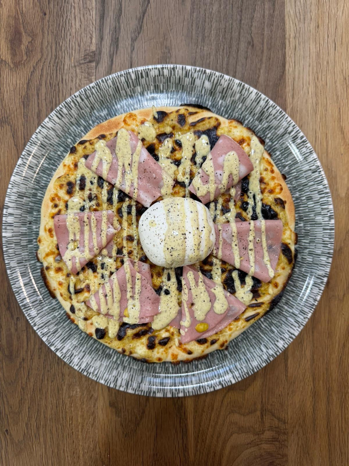 base crème de pistache, mozzarella, mortadelle pistache, burrata, poivre