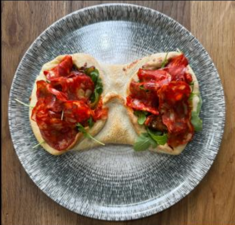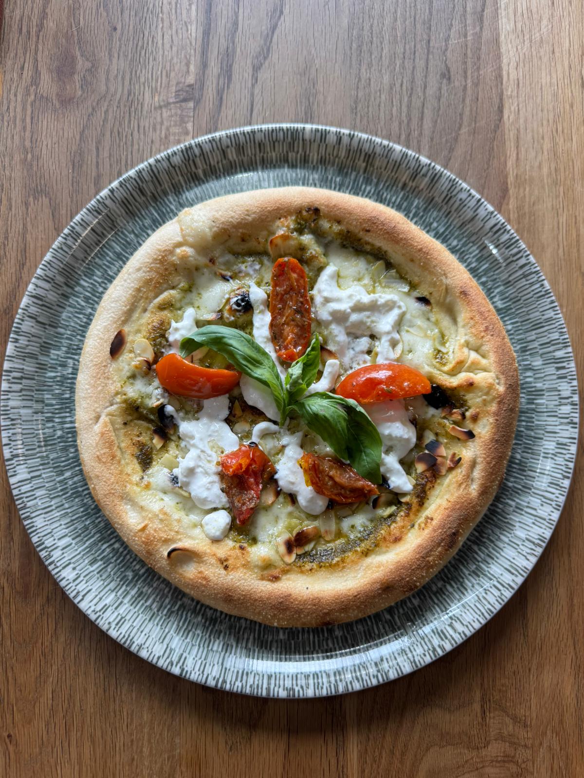 Base tomate, mozzarella, poivrons, roquette, tomates confites, spianata piccante, huile d’olive